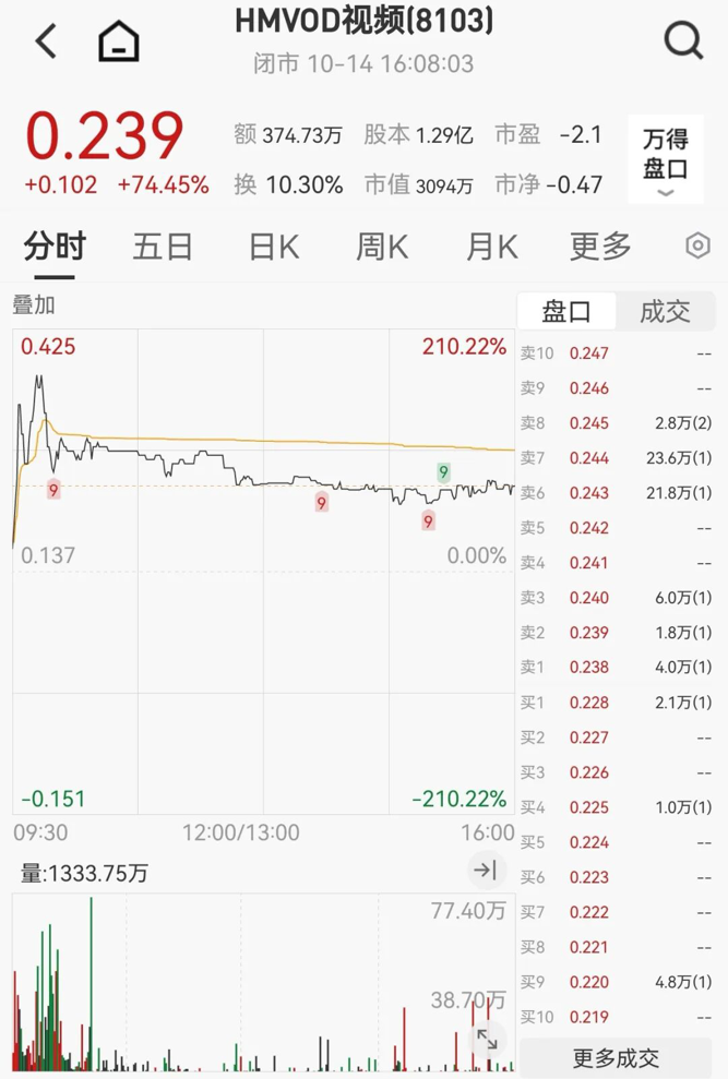 HMVOD视频开盘即直线飙升,最高涨幅达210.22%,随后涨幅收窄,全天收于0.239港元,涨幅仍高达74.45%。