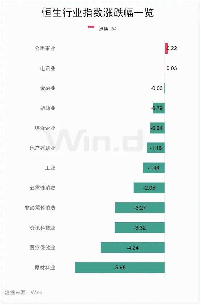 恒生行业指数方面,原材料业指数大跌5.95%,医疗保健业指数跌4.24%,资讯科技业指数跌3.32%;公用事业指数微涨0.22%,电讯业指数微涨0.03%。