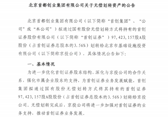 10月15日,北京首都创业集团有限公司(以下简称首创集团)拟通过国有股份无偿划转方式,将其持有的首创证券9742.316万股A股股份(占首创证券总股本的3.56%)划转给北京市基础设施投资有限公司(以下简称京投公司)。