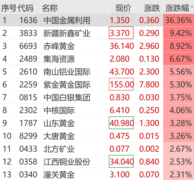 10月8日,港股有色金属板块整体走高,黄金股继续走强。赤峰黄金、紫金黄金国际、山东黄金、江西铜业股份等大市值个股集体走高。中国金属利用盘中飙涨,涨超36%。