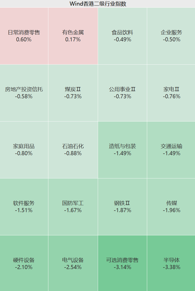 行业板块方面,上午港股半导体、可选消费零售、电气设备、传媒等板块集体走低,富士康、SaaS、紫光系、芯片等概念股不振;有色金属、日常消费等板块逆市走强,黄金股持续火热。