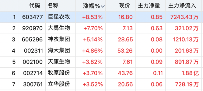 个股方面,牧原股份涨3.7%,现报43.76元/股,最新市值达2501亿元;巨星农牧涨超8%,大禹生物涨超7%,神农集团、华统股份、海大集团等跟涨。