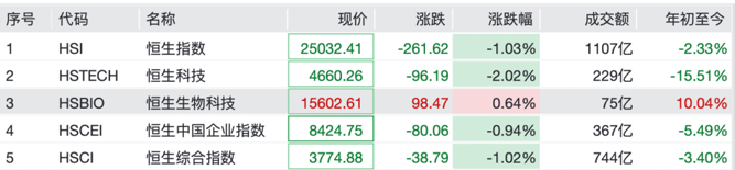 港股市场涨跌不一,恒生生物科技指数上涨。截至发稿,恒生指数跌超1%,恒生科技指数跌超2%,恒生生物科技上涨0.64%。个股方面,再鼎医药、诺诚健华、金斯瑞生物科技、翰森制药、康哲药业等纷纷上涨,而华虹半导体跌逾4%,小米集团、中芯国际、阿里巴巴均跌超3%。