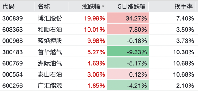 个股方面,博汇股份录得20cm涨停,杰瑞股份、和顺石油、蓝焰控股、贝肯能源均录得10cm涨停,科力股份、中曼石油、通源石油、首华燃气等纷纷上涨。