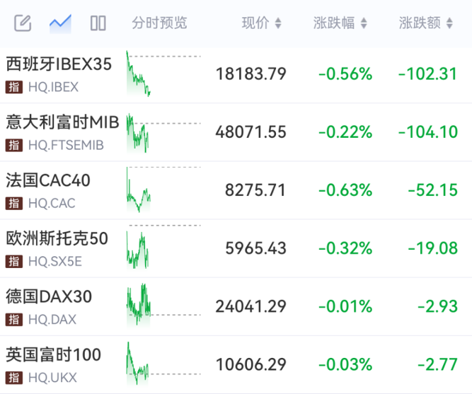 欧洲主要股指震荡飘绿,现货黄金、现货白银走低。