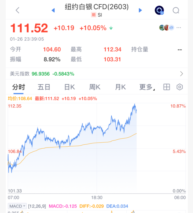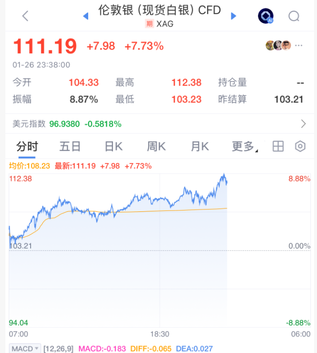 1月26日晚间,现货白银涨势不止,向上触及112美元/盎司,日内一度涨超8%。纽约期银也一度突破112美元/盎司,日内涨超10%。