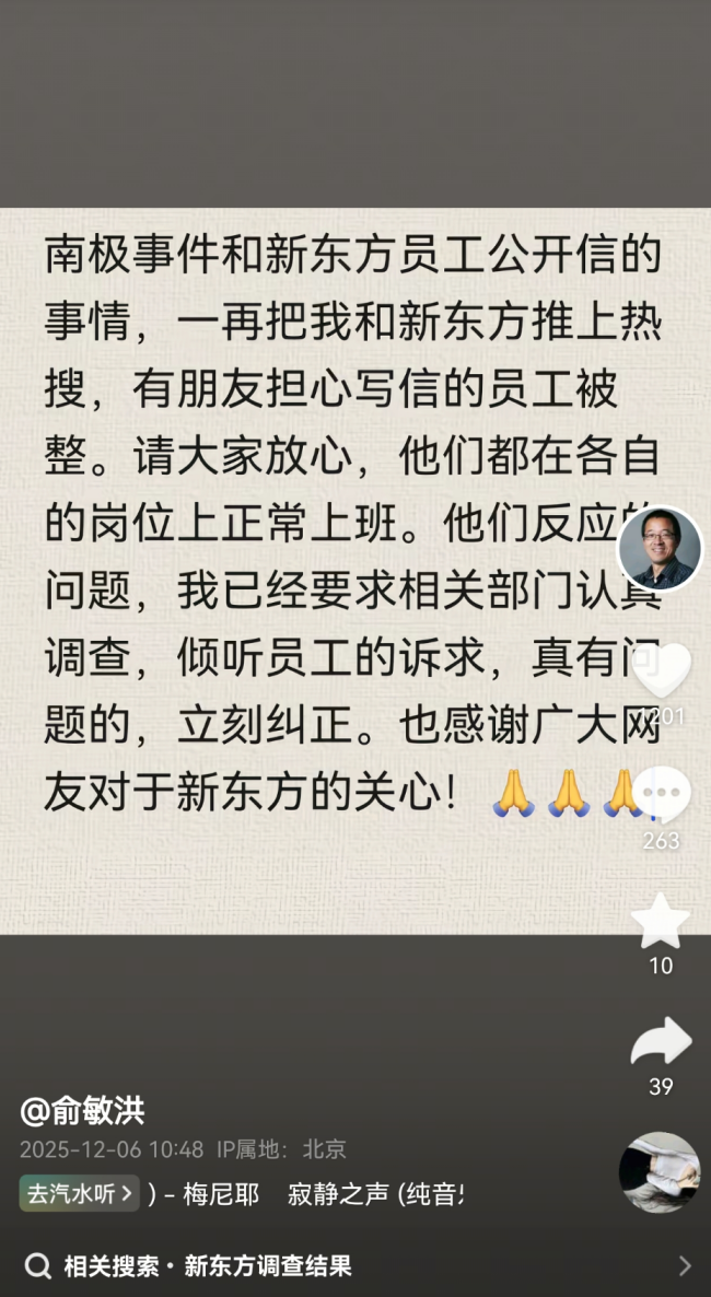 12月6日,新东方创始人俞敏洪发文称:“南极事件和新东方员工公开信的事情,一再把我和新东方推上热搜,有朋友担心写信的员工被整。请大家放心,他们都在各自的岗位上正常上班。他们反映的问题,我已经要求相关部门认真调查,倾听员工的诉求,真有问题的,立刻纠正。也感谢广大网友对新东方的关心!”