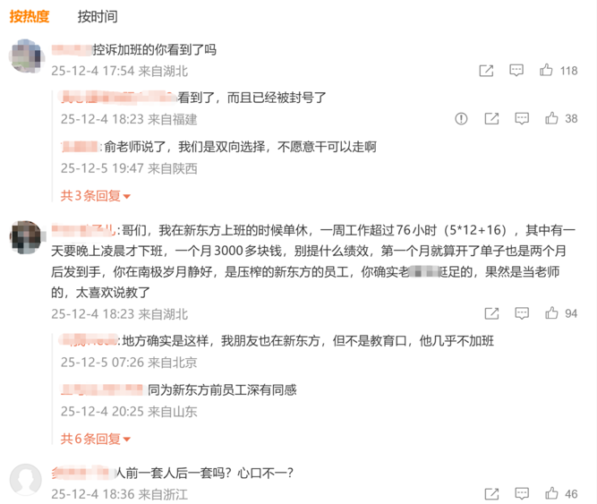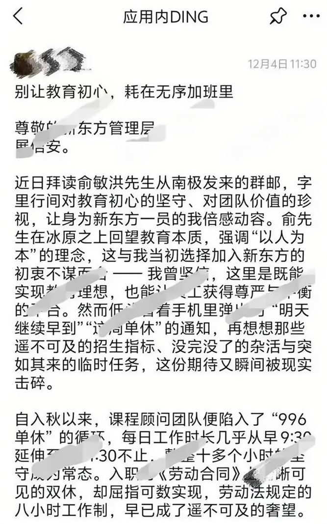 12月4日,一名新东方员工通过钉钉App发表全员信,再次引发关注。该员工称,俞敏洪在南极发信谈“教育初心”和“以人为本”,自己却陷在“每天工作超12小时”“遥不可及的招生指标”里,劳动合同里的双休已成奢望。
