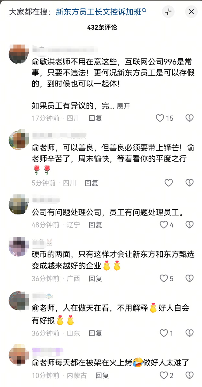 对于俞敏洪此次发声,有抖音网友表示,“互联网公司‘996’是常事,只要不违法”“公司有问题处理公司,员工有问题处理员工”“做好人太难了”。