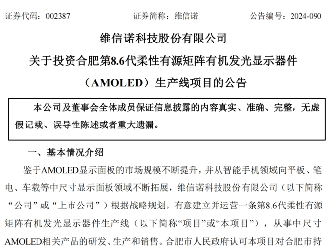 维信诺前身为黑牛食品,于2016年完成业务剥离并全面转型至OLED显示领域,当前主营业务涵盖OLED小尺寸、中尺寸显示器件及Micro-LED显示屏的研发、生产与销售,产品应用于智能手机、智能穿戴、平板、笔记本电脑、车载显示及超大尺寸显示等场景。