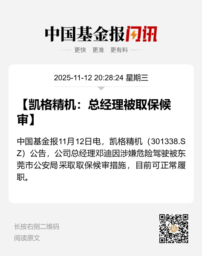 11月12日晚间,凯格精机发布公告称,公司当日收到总经理邓迪的通知,其因涉嫌危险驾驶,可能被判处管制、拘役或独立适用附加刑。