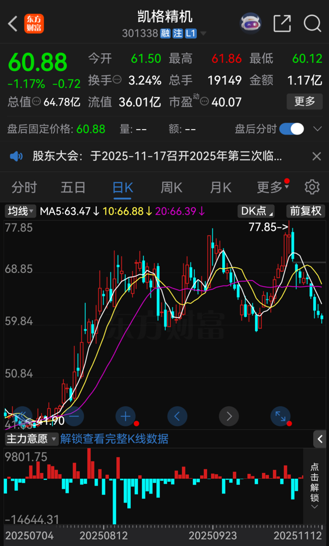 11月12日收盘,凯格精机股价报60.88元/股,跌幅达1.17%,总市值为64.78亿元。