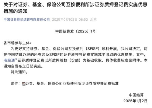 2025年1月2日上午,据中国结算消息,为更好支持证券、基金、保险公司互换便利(SFISF)顺利开展,公司决定,对在中国结算办理的所有涉及SFISF的证券质押登记费实施减半收取的优惠措施,其中,港股通证券质押登记费以所质押股数(份额)为基础收取。