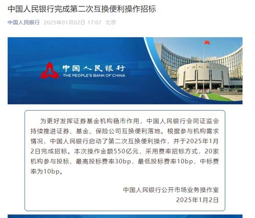 1月2日盘后,据央行官网,为更好发挥证券基金机构稳市作用,中国人民银行会同证监会持续推进证券、基金、保险公司互换便利落地。根据参与机构需求情况,中国人民银行启动了第二次互换便利操作,并于2025年1月2日完成招标。本次操作金额为550亿元,采用费率招标方式,20家机构参与投标,最高投标费率30bp,最低投标费率10bp,中标费率为10bp。