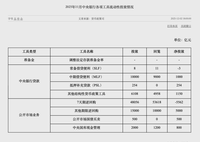 12月2日,人民银行公布2025年11月中央银行各项工具流动性投放情况。数据显示,11月买断式逆回购、中期借贷便利(MLF)分别净投放5000亿元、1000亿元,公开市场国债买卖净投放500亿元。