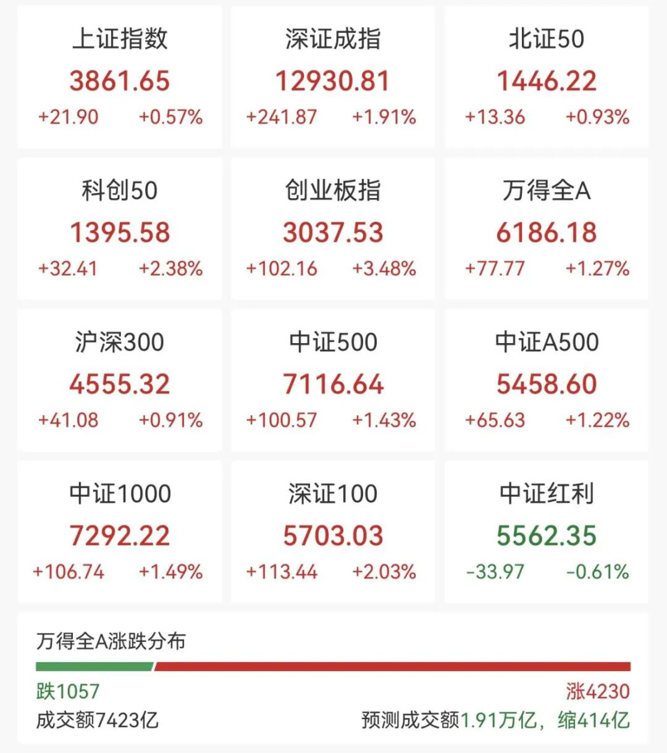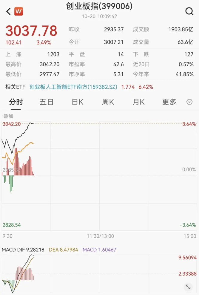 10月20日开盘,A股三大指数集体走高,创业板指涨超3%,深成指涨近2%。