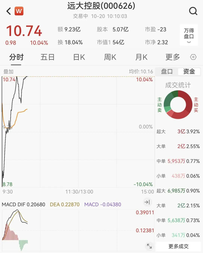 远大控股早盘涨停后直线跌停,随后震荡拉升涨停,上演“天地天板”,实现五连板,现报10.74元/股。