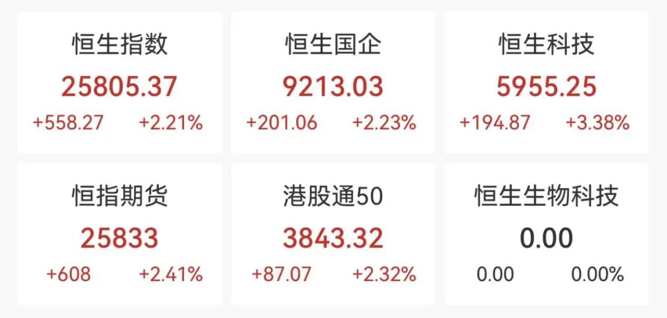 港股方面,三大指数纷纷走高,恒生科技指数涨超3%,网易、蔚来、阿里巴巴等涨超4%。
