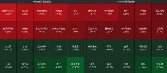 从板块上来看,算力硬件股领涨市场,CPO、电子元器件、半导体等板块涨幅居前;贵金属、银行、农业等板块震荡调整。个股方面,超4200只个股上涨。