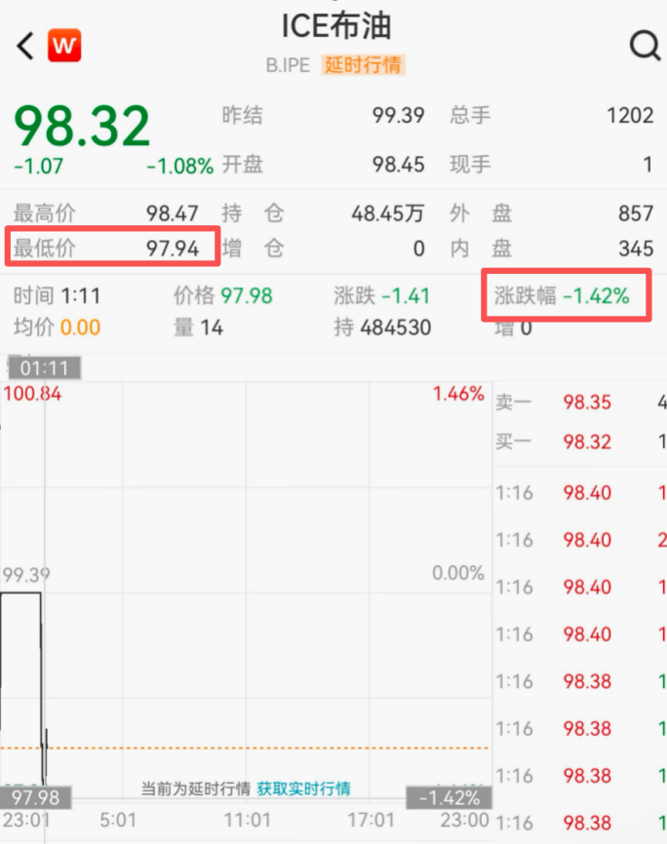 布伦特原油一度下跌1.42%,最低报97.94美元/桶,跌破98美元。