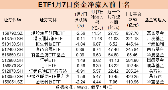 Wind数据显示,1月7日,港股ETF占据非货ETF资金净流入榜前三名,其中,港股通互联网ETF、港股通非银ETF资金净流入均超过11亿元,恒生科技ETF资金净流入超过6亿元。