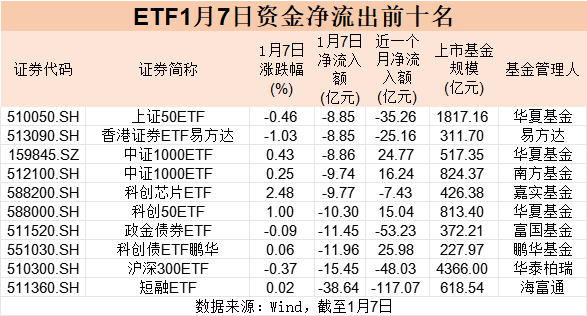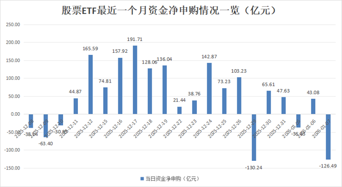 银河证券基金研究中心数据显示,截至1月7日,全市场股票ETF(含跨境ETF)资金净流出超126亿元,这也是今年以来股票ETF首次出现百亿元级别资金净流出。