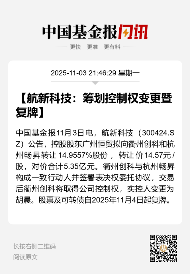 11月3日晚间,航新科技发布公告称,公司控股股东将变为衢州创科未来企业管理合伙企业(有限合伙)(以下简称衢州创科),实控人将变为胡晨。