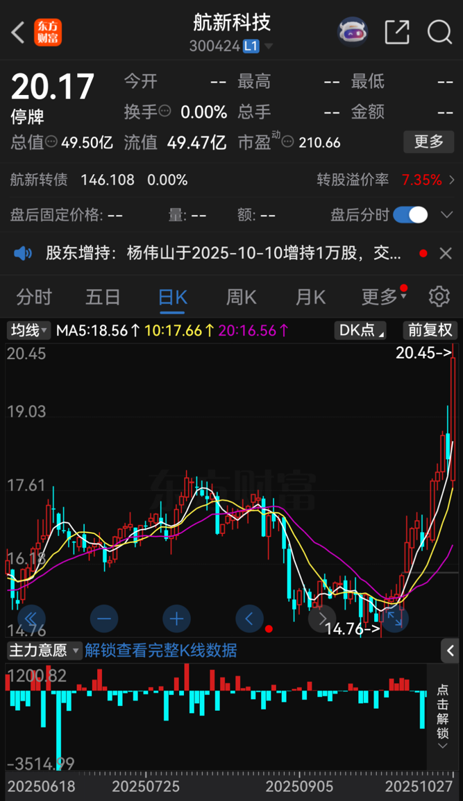 针对上述易主事项,航新科技自10月28日开市起停牌,计划自11月4日开市起复牌。10月27日收盘,航新科技股价报20.17元/股,总市值为49.50亿元。