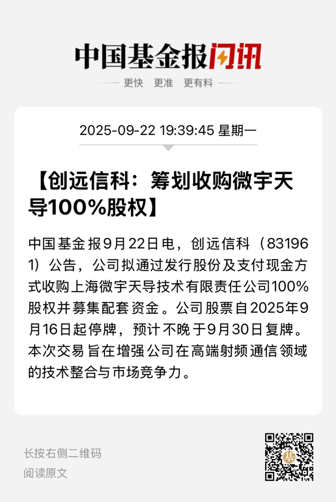 停牌一周的创远信科,于9月22日晚公布了重大资产重组预案,公司股票自2025年9月23日起复牌。