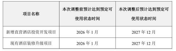 值得一提的是,在业绩承压背景下,公司10月24日宣布,将“新增直营酒店投资开发项目”和“现有酒店装修升级项目”完工时间从2026年1月延至2027年12月。