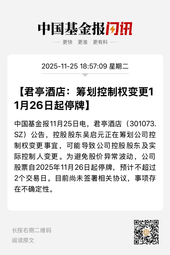 11月25日,君亭酒店公告称,公司控股股东吴启元正在筹划公司控制权变更相关事宜,可能导致公司控股股东及实际控制人发生变更。