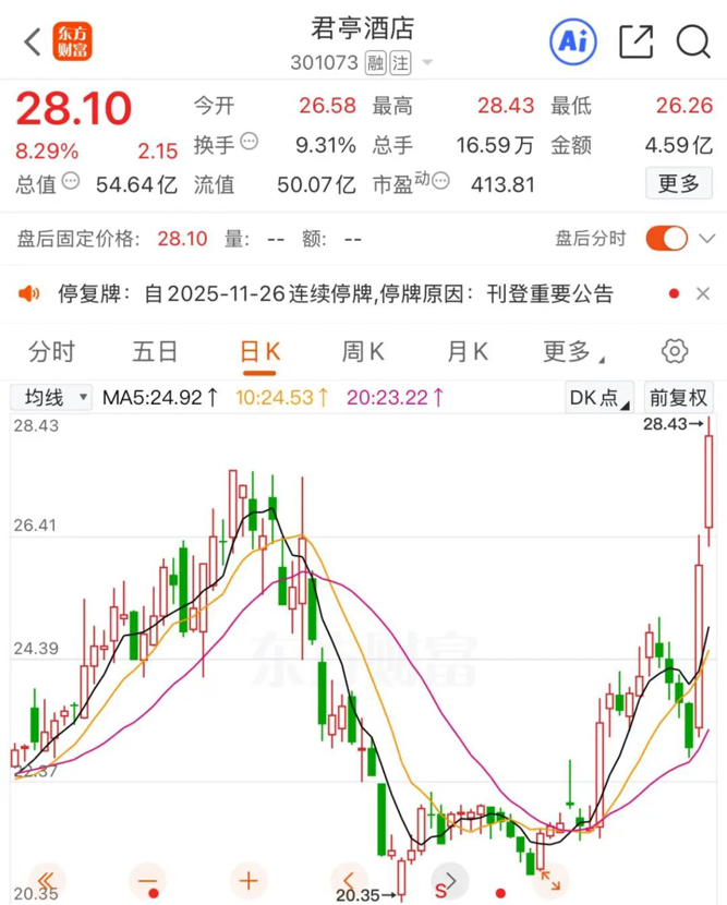 在停牌的前两个交易日(11月24日—25日),君亭酒店放量大涨,累计涨幅达22.65%。截至11月25日收盘,君亭酒店报28.10元/股,总市值为54.64亿元。