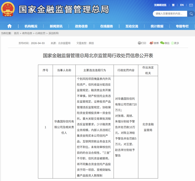 4月3日,国家金融监督管理总局官网公布的行政处罚信息公开表显示,华鑫信托被北京金融监管局罚款720万元,多名责任人被警告及罚款。