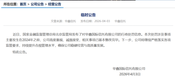 4月3日,华鑫信托在官网发布公告称,本次处罚涉及事项主要发生在2024年之前,公司高度重视、诚恳接受,相关事项已基本整改完毕。下一步,公司将继续严格落实各项监管要求,持续提升合规管理水平,确保公司稳健经营与高质量发展。