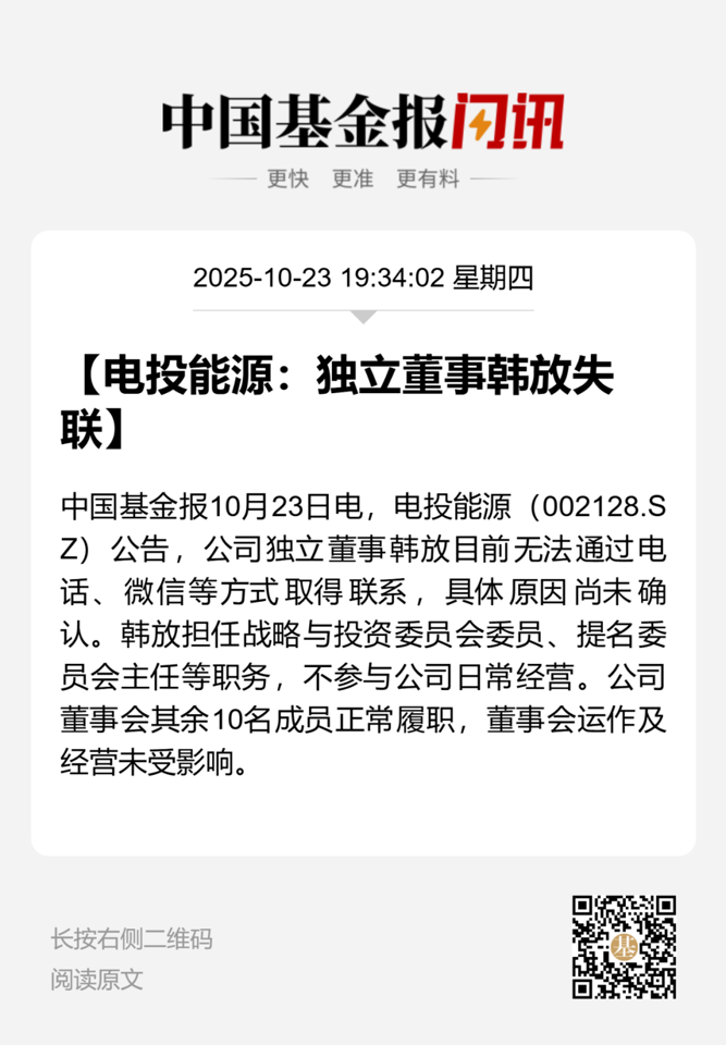 10月23日晚间,国家电力投资集团旗下的电投能源发布公告称,近日公司工作人员多次通过电话、微信等方式,与公司第八届董事会独立董事韩放联系,均无法与其本人取得联系。截至公告日,公司尚未收到韩放的回复,无法确定韩放无法取得联系的具体原因。