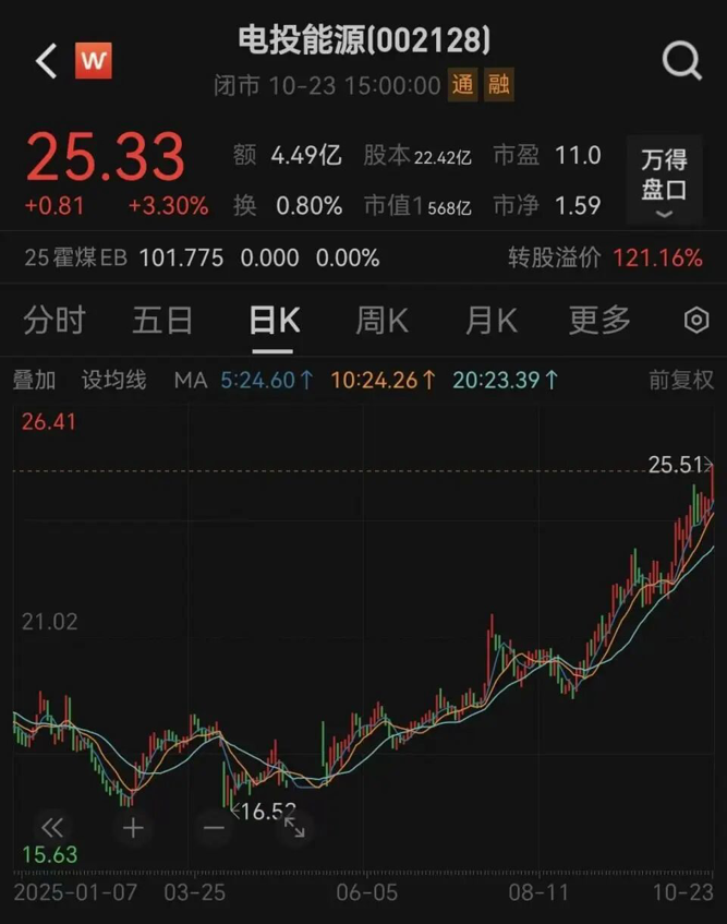 10月23日,电投能源股价以25.33元/股报收,最新市值为568亿元。