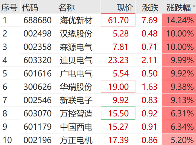 1月20日,电网设备板块盘初火热,森源电气、汉缆股份、广电电气等均实现3连板,海优新材涨超10%,新联电子、万控智造等跟涨。