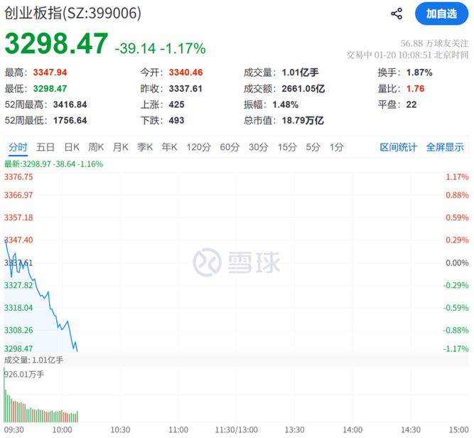 1月20日早间,A股三大指数小幅高开,短暂拉升后震荡下行。截至发稿,上证指数跌0.37%,深证成指跌0.99%,创业板指跌1.17%。