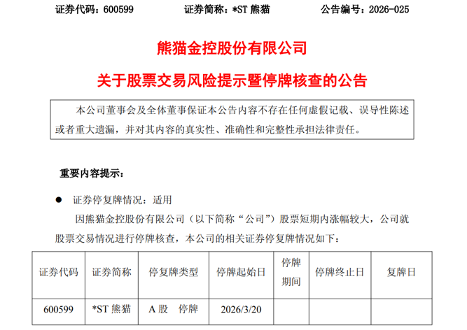 3月19日晚间,*ST熊猫发布公告称,因公司股票短期内涨幅较大,将自3月20日开市起停牌核查。