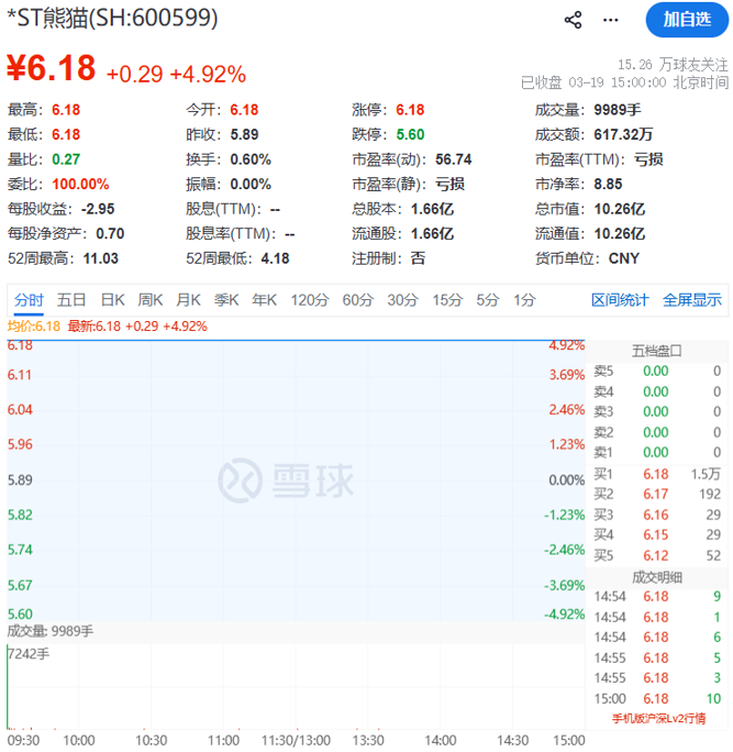 截至3月19日收盘,*ST熊猫股价报6.18元/股,总市值为10亿元。