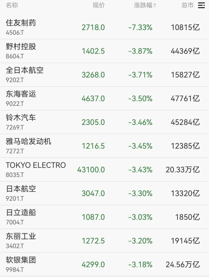 此外,野村控股、全日本航空、东京电子、软银集团等跌幅居前。