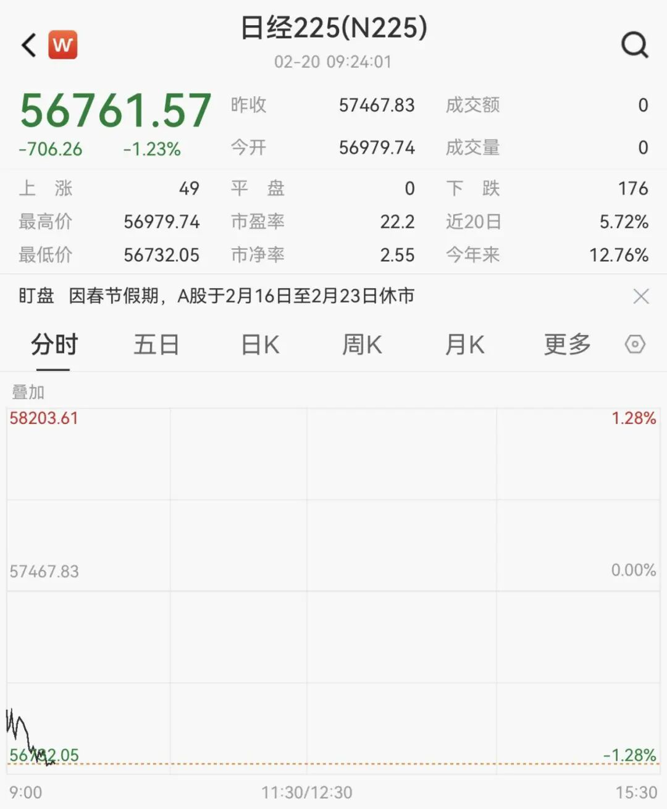 2月20日,日韩股市开盘涨跌不一,日本股市震荡下挫,日经225指数跌幅扩大至1.3%,最新报56761.57点。