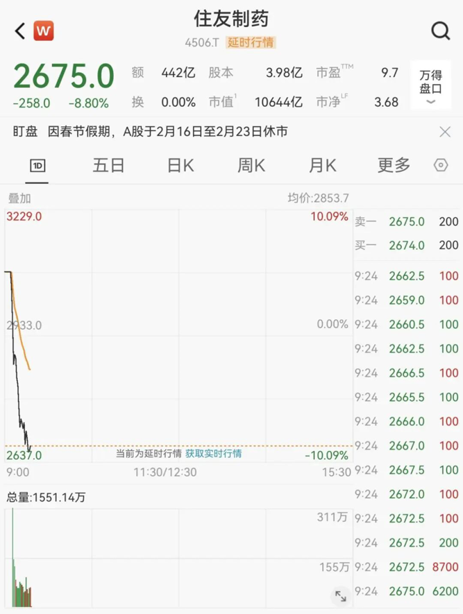 个股方面,日本制药股走低,住友制药直线下挫,一度大跌超10%。