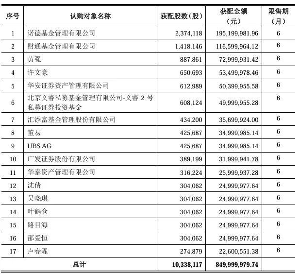 图二:惠城环保最终确定的发行对象及获配金额