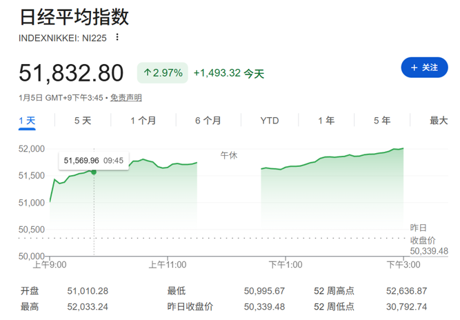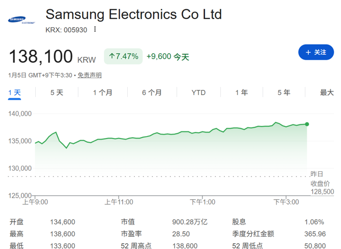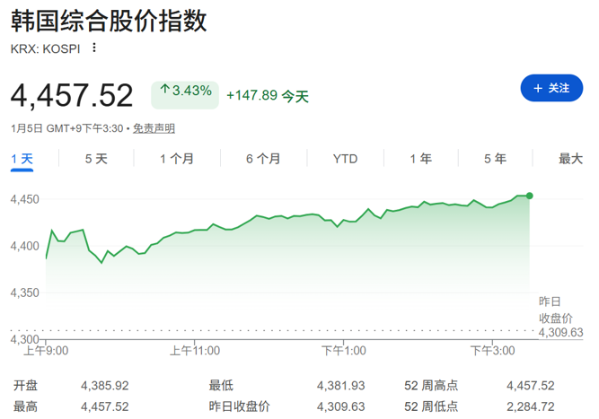 韩国股市延续涨势,KOSPI指数上涨3.15%,刷新历史新高至4448.52 点。权重股三星电子大涨逾7%,此前其联席CEO卢泰文周一表示,公司计划在今年把搭载谷歌Gemini的AI功能手机设备数量增加一倍。