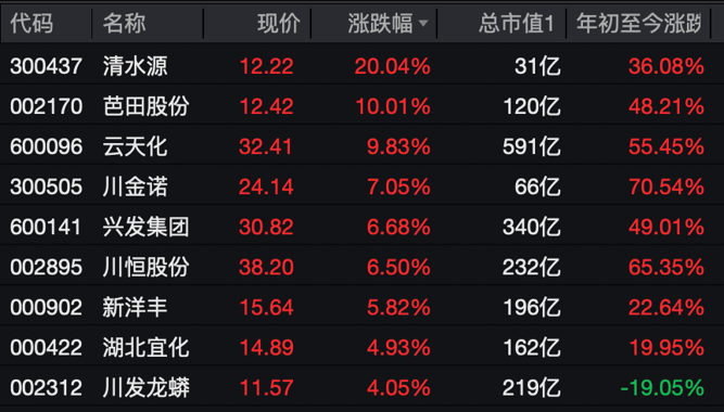 个股方面,清水源、芭田股份、澄星股份、云天化均涨停。