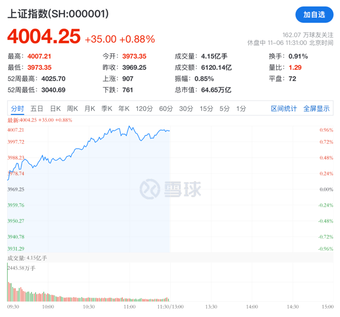 11月6日上午,A股三大股指集体高开高走,沪指重回4000点关口上方,科创50指数一度涨逾3%。截至午间收盘,沪指涨0.88%,深证成指涨1.39%,创业板指涨1.39%。