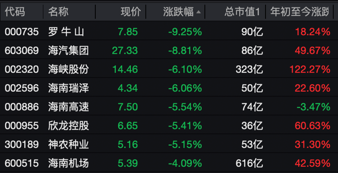 海南自贸区板块同样大幅回落,海汽集团盘中一度跌停,罗牛山、海峡股份、海南瑞泽跌幅居前。