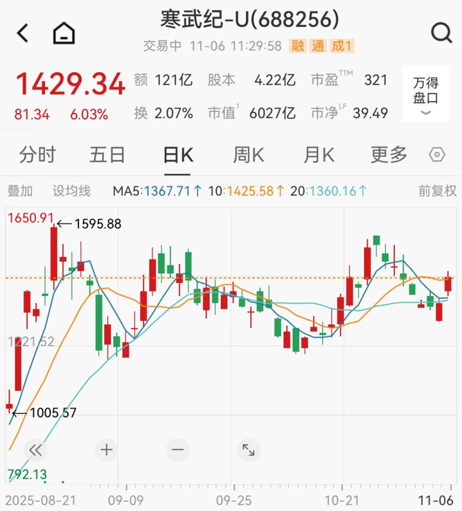 寒武纪大涨6%,现报1429.34元/股,最新市值为6027亿元。