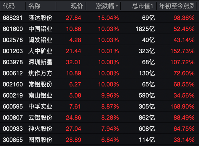 个股方面,深圳新星一字涨停,闽发铝业、常铝股份直线涨停,中国铝业10cm涨停,大中矿业、焦作万方、南山铝业纷纷涨停。